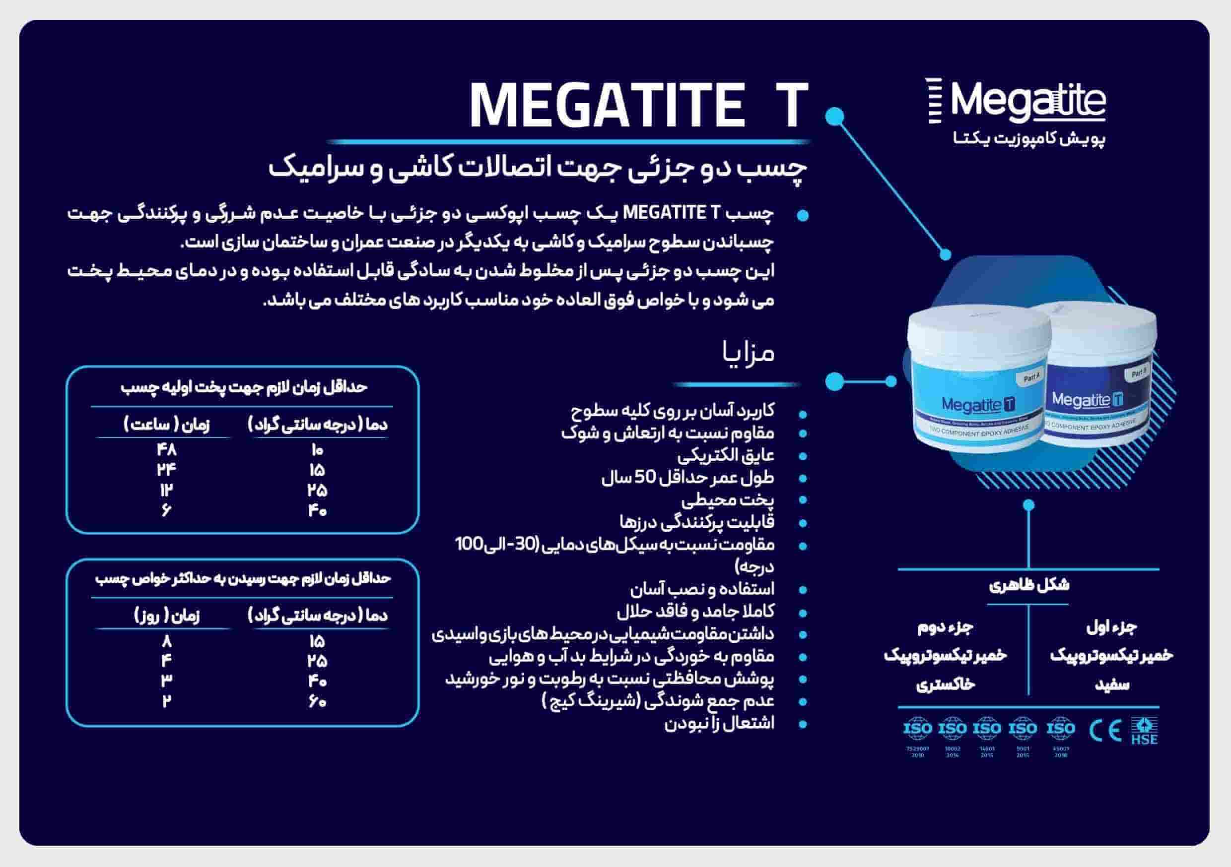 چسب اپوکسی مگاتایت T چسب اپوکسی دو جزئی با خاصیت عدم شررگی و پرکنندگی جهت چسباندن سطوح سرامیک و کاشی به یکدیگر در صنعت عمران و ساختمان سازی است.