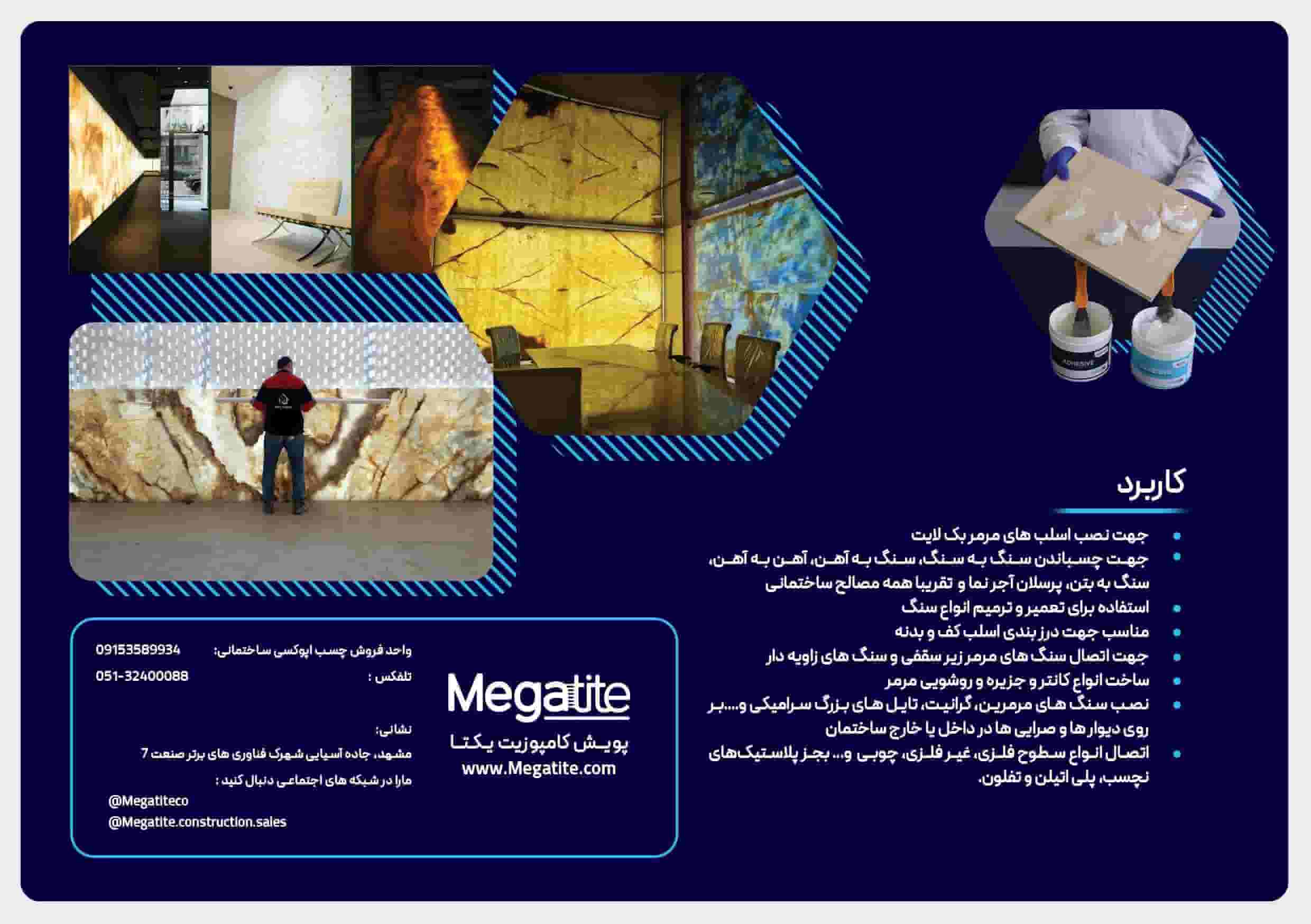 مهم ترین ویژگی چسب MEGATITE C قابلیت عبور نور در کنار قدرت باربرداری زیاد است از این رو این محصول جهت نصب سنگ های مرمر بکلایت استفاده میشود به طوری که بعد از استفاده از این چسب محل اتصال لقمه ها مشخص نیست و جلوه زیبایی سنگ بکلایت را بیشتر می کند.