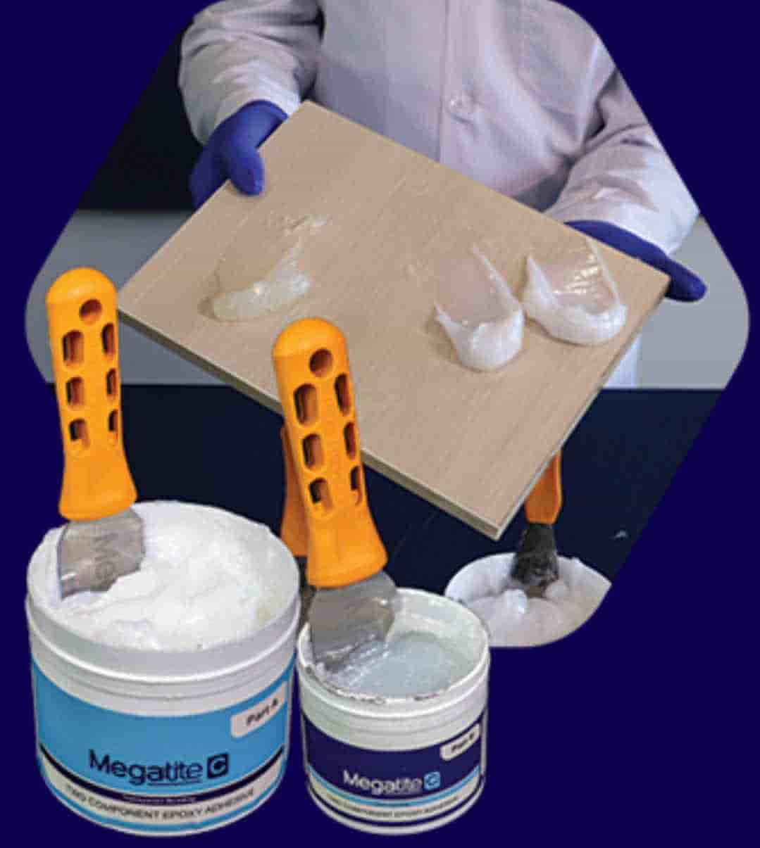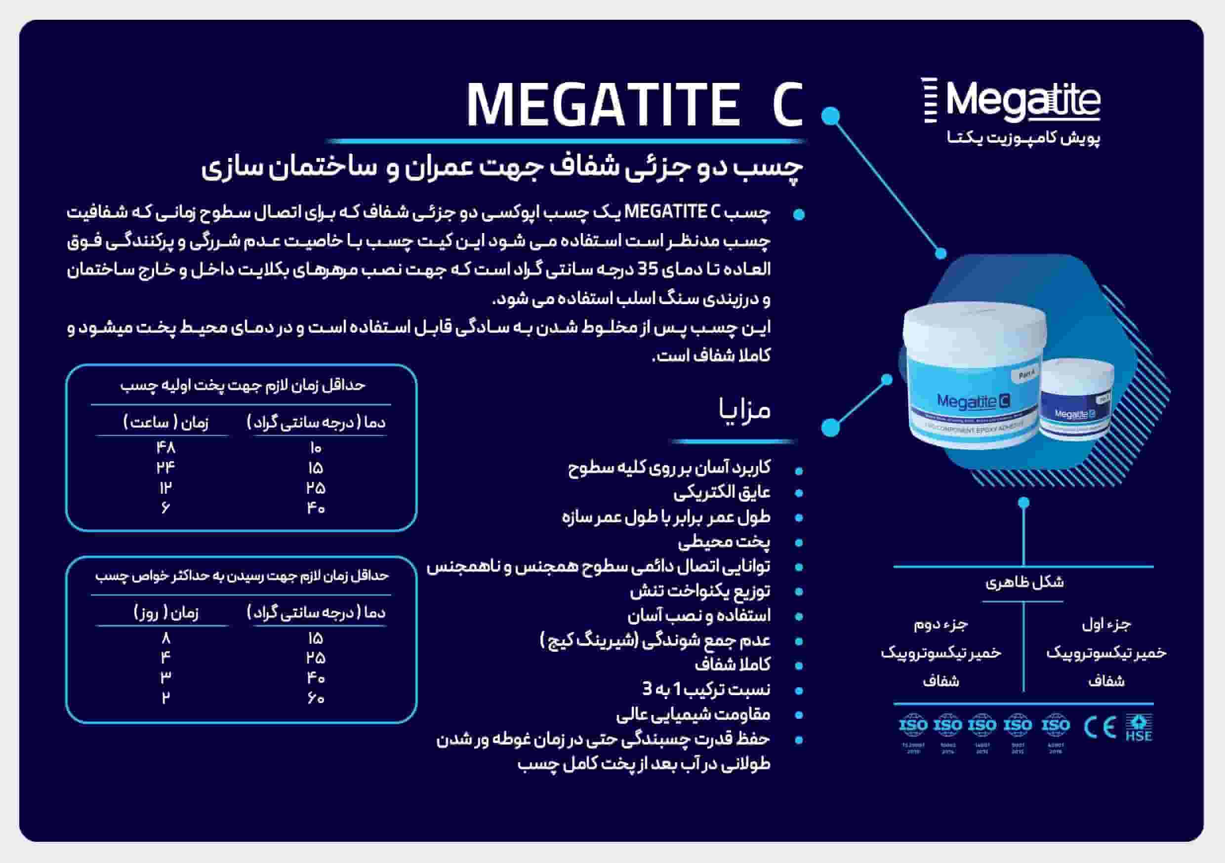چسب دو جزیی شفاف مگاتایت C، یک چسب اپوکسی دو جزئی شفاف که برای اتصال سطوح زمانی که شفافیت چسب مدنظر است استفاده میشود این کیت چسب با خاصیت عدم شررگی و پرکنندگی فوق العاده تا دمای 35 درجه سانتی گراد است که جهت نصب مرمر های بکلایت داخل و خارج ساختمان و درزبندی سنگ اسلب استفاده می شود. این چسب پس از مخلوط شدن به سادگی قابل استفاده است و در دمای محیط پخت میشود و شفاف است.